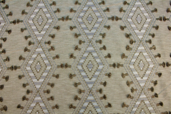 Ground Breaker in Flaxen is a beautiful embroidered geometric fabric by the yard. The recommended uses for this fabric include creating custom draperies, roman shades, bedding, pillows, window treatments, and other light upholstery fabrics.