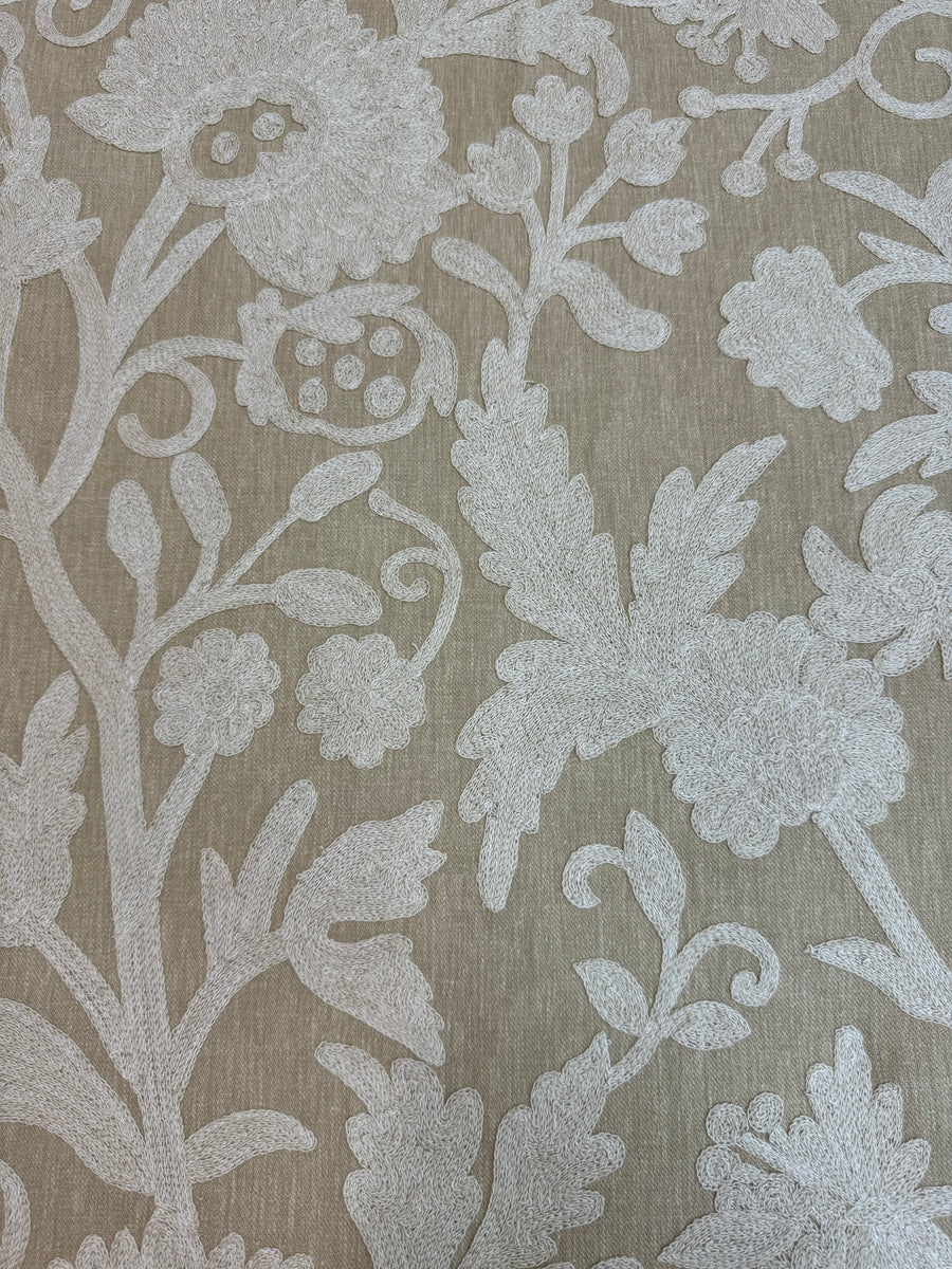 Lillian in Tussah is a beautiful natural embroidered fabric by PKaufmann. The recommended uses for this fabric include creating custom draperies, roman shades, bedding, and light upholstery projects. This fabric requires a three yard minimum.