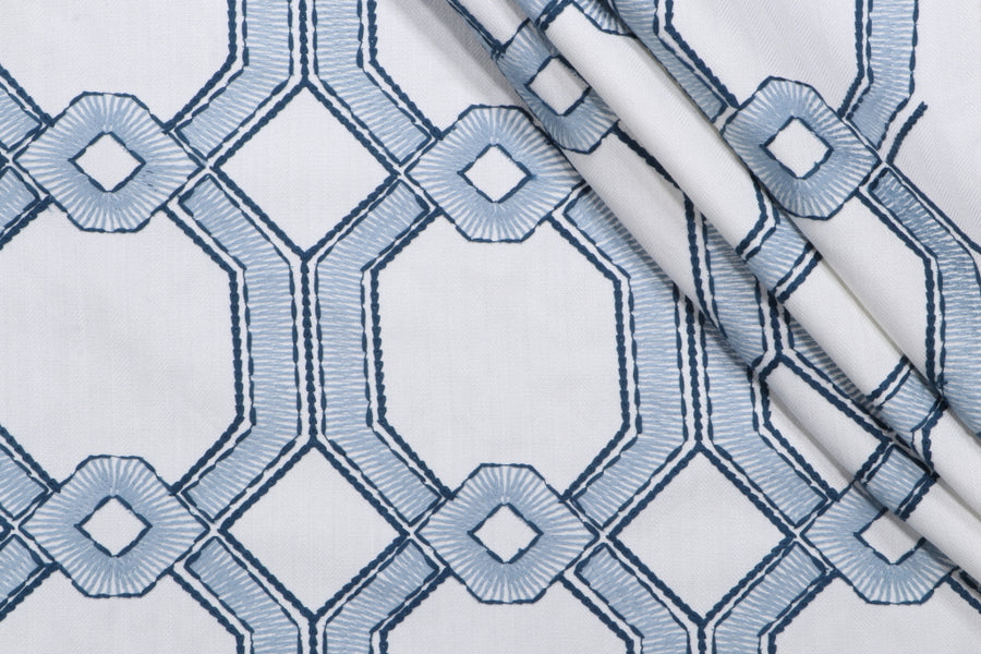 Avignon in Delft is a beautiful geometric fabric, perfect for custom draperies, bedding, pillows, headboards, and other interior design projects.