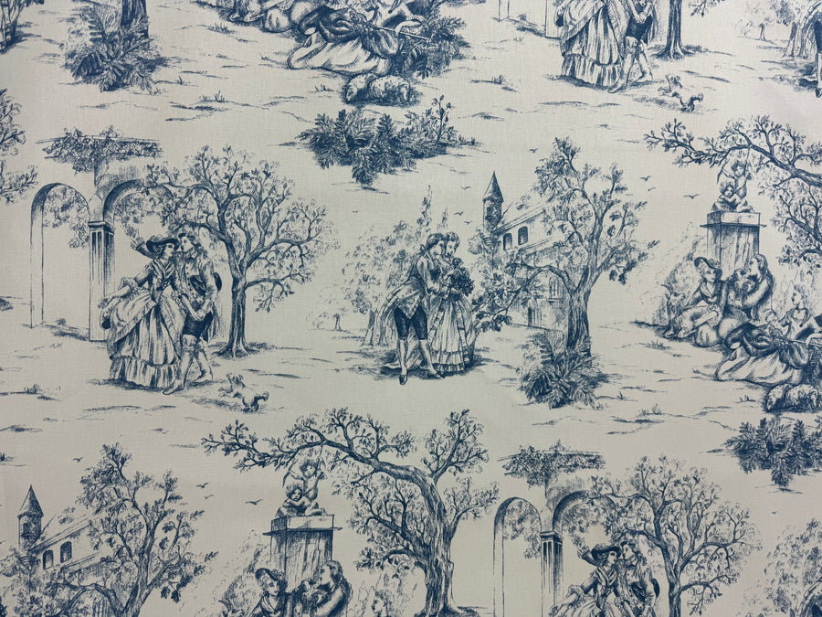 Blue and white toile fabric by the yard, recommended use: drapery, bedding, pillows, light upholstery.