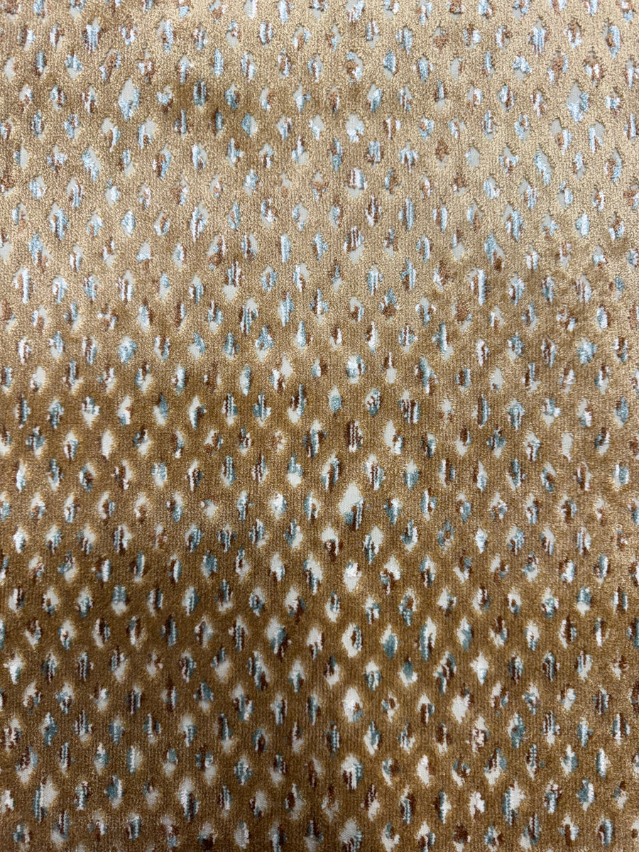 This beautiful cut velvet by Hamilton Fabrics adds the perfect touch to any room. This geometric velvet is sure to be an attention grabber, and the camel and teal color scheme is sure to work with many different rooms. This fabric is used best for upholstery, furniture, pillows, and bedding.